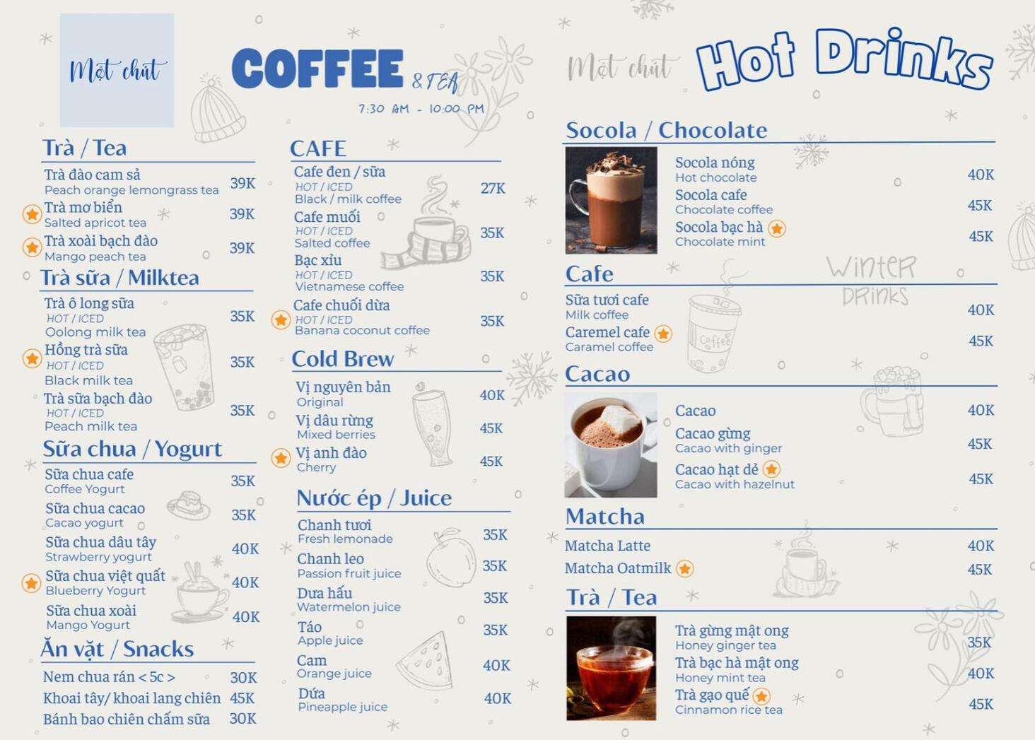 Hãy khám phá menu và chọn cho mình một chút dịu dàng, một chút tỉnh táo hay một chút cảm hứng cho ngày mới.